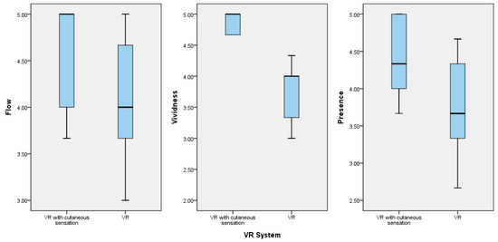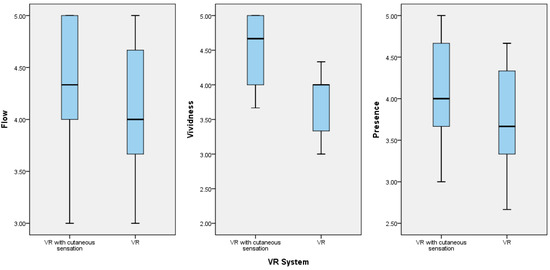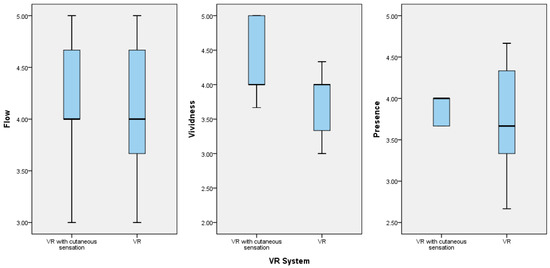 Comparison of the boxplots for the flow, vividness, and presence variables of the group of study participants who played the fire safety education VR game with cutaneous sensation and the group that played the basic fire safety education VR game.