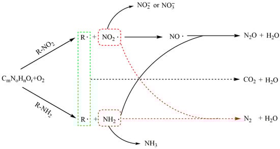 The degradation of nitrogenous wastes can produce stubborn intermediates, and the resulting acids and/or salts can lead to corrosion and salt deposition in the reactor, so the treatment of nitrogenous wastes in SCWO is relatively difficult [36]. The products of N-containing species include N2, nitrate, ammonia, nitrite, and NOx, depending on the state and position of N atoms in organics [37], reaction conditions [38], and the presence or absence of catalysts [39] or auxiliary fuels [40,41]. In the new study, ammonia can be effectively removed through ion exchange with zeolite in intensified SCWO process and ammonia removal was up to 97% when ion exchange was applied to SCWO as a subsequent step [42]. Nitrate is mainly obtained from the compounds containing nitro-group and diazonium, while ammonia is primarily produced from amino-group and N-heterocyclic compounds [37], and N2 is formed through the interaction of amino and nitro group [43]. Killilea [44] found that all forms of nitrogen, such as ammonia, nitrate, nitrite and organic nitrogen, could be converted into N2 or N2O rather than NOx under appropriate supercritical water conditions, and that N2O could be further removed by adding catalysts or raising reaction temperature. Additionally, Tan et al. studied the synergistic denitrification mechanism in SCWO processes and found the intermolecular synergistic denitrification between nitro and amino/N-heterocyclic compounds had weaker denitrification efficiency than the intramolecular synergistic denitrification [45]. Figure 2 shows the degradation path of the compound containing N, and CmNoHnOr can be considered either as an initial reactant or as an unstable intermediate.