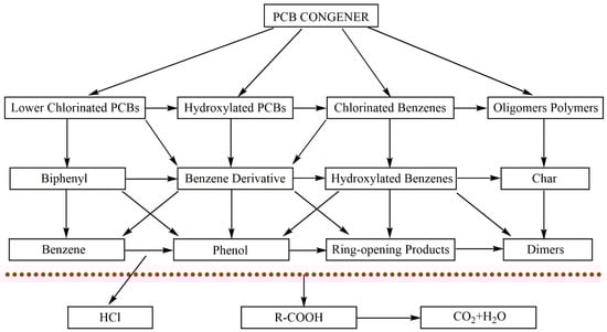 Gheorghe et al. [109] developed principal reaction pathways in the biphenyl SCWO reaction network, as shown in Figure 6. In their research, more than 50 intermediates detected under various SCWO conditions were mainly benzene derivatives such as acetophenone and dibenzofuran. The degradation of biphenyl was initiated by OH• to hydroxylbiphenyl, in which ortho-hydroxylbiphenyl and para-hydroxylbiphenyl are more reactive than meta-hydroxylbiphenyl. The hydroxylbiphenyl formed open-ring carbonylic compounds through keto-enol tautomerism in the subsequent oxidation process and eventually into mineral products. However, Onwudili and Williams [108] found different ring-opening products, such as phenylethene, benzaldehyde, phenylethen-2-ol, and acetophenone, when investigating the degradation of biphenyl. This was probably caused by lower temperatures (<380 °C) and pressure (<22.5 MPa) while Gheorghe’s study [109] was carried out in higher temperatures (673–823 K) with methanol as the auxiliary fuel.