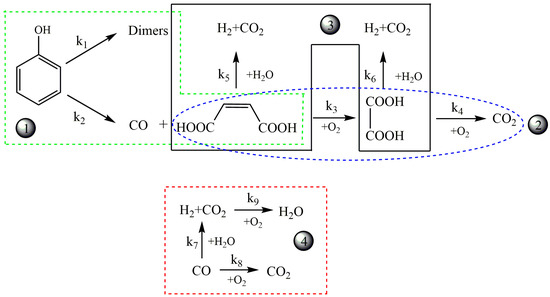 Matsumura et al. [106] analyzed the effect of phenol concentration on reaction intermediates at constant oxygen content. The reaction product distribution varied with concentration and tarry material production was observed in high phenol concentration phenol, which was probably because the concentration of phenol did not affect the initial phenol decomposition reaction but the subsequent radical reaction. The high phenol concentration accelerated the additive reaction between aromatic compounds. Additionally, the reaction pathways for the SCWPO of phenols were also investigated [107]. Guan et al. [107] developed the pathways and a kinetic model of partial oxidation phenol at 450 °C and 24 MPa, which included nine reaction paths and eight kinetic equations. The model precisely depicts the concentration changes of CO, H2 and CO2, in which CO concentration initially increased rapidly, peaked, and then dropped slowly, while H2 and CO2 concentration increased slowly after a rapid increase in the beginning. Figure 4 depicts the four types of main reactions for partial oxidation phenol, including (1) phenol oxidation (both dimerization and ring-opening), (2) acid oxidation, (3) acid gasification, and (4) gaseous products interconversion. The kinetics model again presented the experimental results well and had good predictions for the composition of the gas effluent. It is worth noting that the rate constant for dimers formation (k1) was extremely small, indicating phenol barely converted to dimers in the presence of oxygen.
