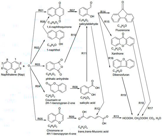Xu et al. [110] summarized a four-step oxidation process for naphthalene degradation in SCW: (1) One benzene ring breaks and forms light hydrocarbons such as formic acid, acetic acid and other aromatic hydrocarbons including aromatic carboxylic acid, ketone and aromatic ester. (2) The polymerization of some intermediates forms dibenzofuran, fluorenone and 2’-hydroxyacetophenone. (3) Light hydrocarbons and polymers oxidize and produce acetic acid at the same time during the polymerization. (4) Acetic acid and other intermediates decompose to CO2 and H2O. Figure 7 displays the reaction network for naphthalene degradation in their subsequent studies, including five main ways (R01–R05) for oxygen to “invade” naphthalene rings [98].