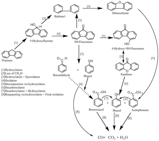 As expected, the oxidation of fluorine started with OH• attacking the saturated carbon on the fluorene molecule, which is similar to most other organic compounds [108]. The intermediates found included biphenyl, benzophenone, dibenzofuran, benzofuran, hydroxybenzofuran, xanthone and fluorenone, of which fluorenone is the key intermediate and very stubborn at a lower temperature. The formation of 9-fluorenone, which led to the formation of xanthone or decomposed to benzaldehyde, phenol, acetophenone and other single-ringed aromatic compounds subsequently, may be the major pathway for fluorene oxidation under hydrothermal conditions. Furthermore, the oxidation of fluorene can also be carried out by another possible route, by which the –CH2O group was removed from hydroxylfluorene and 9-fluorenone decarbonylate, leading to the significant production of biphenyl observed. Hence, after the formation of biphenyl, the process assumed the pattern earlier described for biphenyl oxidation in their early study [108]. The further decomposition products included benzofuran, isobenzofuranone, acetophenone and benzoic acid, and the detailed mechanism for fluorene oxidation is presented in Figure 8.