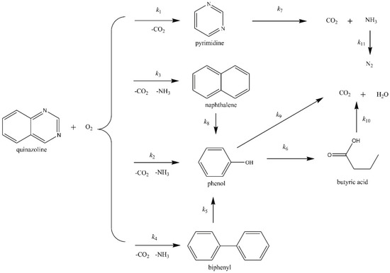 - Gong, Y.; Guo, Y.; Wang, S.; Song, W. Supercritical water oxidation of Quinazoline: Effects of conversion parameters and reaction mechanism. Water Res. 2016, 100, 116–125. [Google Scholar] [CrossRef]