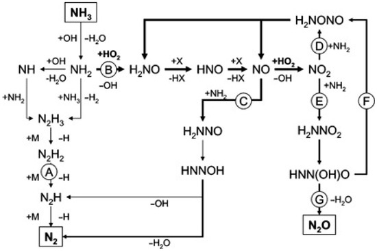 - Ploeger, J.M.; Green, W.H.; Tester, J.W. Co-oxidation of ammonia and ethanol in supercritical water, part 2: Modeling demonstrates the importance of H2NNOx. Int. J. Chem. Kinet. 2008, 40, 653–662. [Google Scholar] [CrossRef]