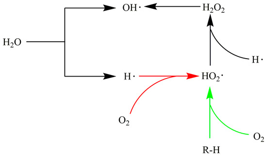 As an oxidant with an oxidation capacity only inferior to F2, OH• free radical with an oxidation potential of 2.8 eV played a key role in the whole oxidation process of organics [30]. An interesting phenomenon emerged by comparing the reaction mechanism between oxygen and hydrogen peroxide. Systems that initially only contained oxygen produced hydrogen peroxide through a propagation reaction, while systems that initially only contained hydrogen peroxide produced oxygen through a thermal decomposition reaction. In the system containing oxygen and water, Tsang W et al. [76] found that the reverse reaction of Equations (14)–(16) existed: