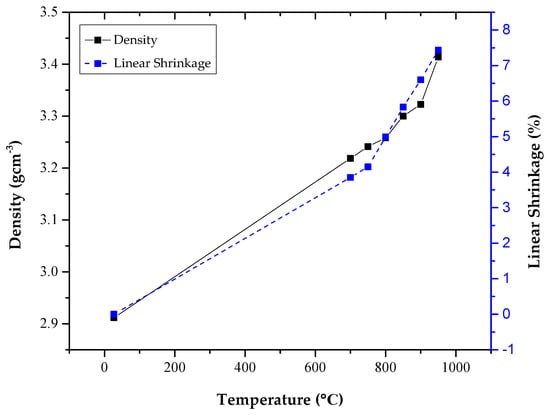 Density accompanied by the linear shrinkage of the zinc silicate glass and glass-ceramics that were heat treated at various sintering temperatures.