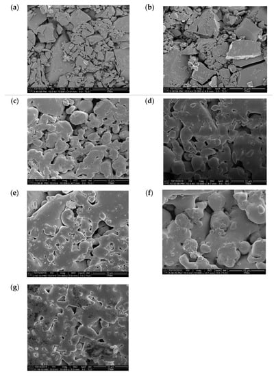 The surface morphology of the zinc silicate glass and glass-ceramics that were heat treated at various sintering temperature: (a) 27 °C, (b) 700 °C, (c) 750 °C, (d) 800 °C, (e) 850 °C, (f) 900 °C, and (g) 950 °C.