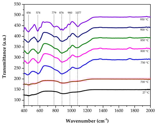 Other than that, by carrying out FTIR analysis, the functional groups of the respective zinc silicate glass and glass-ceramics that could appear in the corresponding materials can be obtained. At a lower sintering temperature, there were four broad SiO4 and ZnO4 bands, whose presence was attributed to the bending modes of the O-Si-O and Si-O-Si bonds, Zn-O stretching vibrational bond, vibrations of Zn-O in the ZnO4 tetrahedral, the decreasing of the Si-O stretching bonds, and the stretching vibrations of the SiO4 and ZnO4 tetrahedron [17]. This four broad SiO4 and ZnO4 bands indicated that there was no formation of zinc silicate glass-ceramics, which agrees with the XRD pattern, where all samples were in an amorphous form at 27 °C and 700 °C. While, for the IR spectrum of the zinc silicate glass-ceramics, there were eight types of absorption bands located at the 459 cm−1 asymmetric deformation of the SiO4, symmetric stretching of ZnO4 at 576 cm−1, asymmetric stretching of ZnO4 at 615 cm−1, bond vibration of SiO4 at 697 cm−1, symmetric stretching of SiO4 at 865 cm−1, and asymmetric stretching of SiO4 at 905 cm−1, 932 cm−1, and 978 cm−1, respectively [18]. From Figure 4, after the sintering temperature reached 750 °C up to 950 °C, a sharp band at 456 cm−1 was spotted at the IR region, showing the asymmetric deformation of the Si-O bond in the SiO4 units. Then, a band at 574 cm−1 associated with the Zn-O symmetric stretching vibration in the ZnO4− was also spotted. While, for the asymmetric stretching of the Zn-O during vibration of the ZnO4 group was located at 615 cm−1. The bands positioned at 779 cm−1 are accredited to the Si-O bond vibration and the bands at 876 cm−1 are subjected to Si-O symmetric stretching vibration [6,19]. Lastly, the band that appeared at 980 cm−1 was transmitted due to the Si-O asymmetric stretching vibration. The band assignation of the IR spectra was tabulated in Table 2. Considering all the IR spectra, it was found that, at first, there were only four broad bands present, proving the formation of the zinc silicate glass. Later, as the sintering temperature increased, there was an additional, sharp band at the IR region, indicating the formation of zinc silicate glass-ceramics, which supports the XRD result.