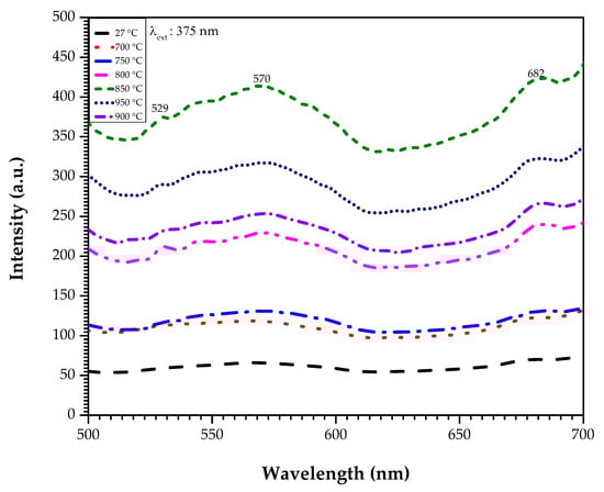 Figure 5 shows the emission intensity of the zinc silicate glass and glass-ceramics that were heat treated at 700, 750, 800, 850, 900, and 950 °C, respectively. The samples were excited at a wavelength of 375 nm. Based on Figure 5, it was evident that three broad emission peaks at 529, 570, and 682 nm appeared.