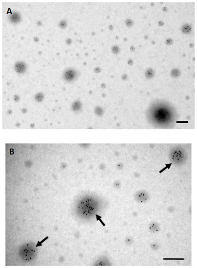 Figure 4. Immunoelectron micrographs of isolated platelet granules in the microchip. (A) This picture shows that the 6-nm gold particle-labeled granules are α-granules, because P-selectin is located on the surface of these granules. The other vesicles not significantly labeled by gold particles might be lysosomes or exosomes. (B) The gold particles labeled granules were shown in higher magnification. There are abundant gold particles located on the surface of α-granules (indicated by arrows). Scale bar, 0.2 μm.