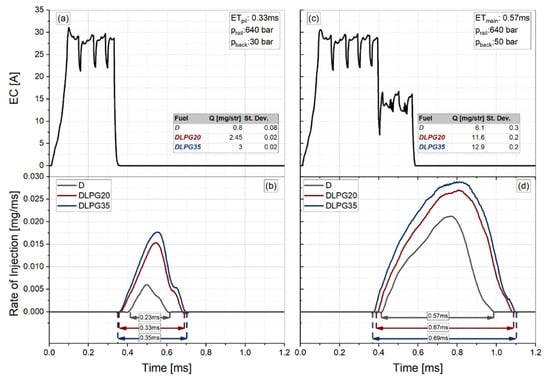 - The first part of the activity was devoted to analyzing the effects of using LPG diesel blends with a conventional common rail diesel injector. The hydraulic characterization assessed the effects of the different compressibility and viscosity of the blends, causing an increase in the injection duration, estimated to be approximately 0.1 ms for both tests carried out. On the other hand, a reduction of the hydraulic delay of 0.35–0.4 ms, and proportionally to the LPG content in the blend, was noted. Therefore, fuel-injected values for almost double the diesel amounts are observed, at the same ET, by using the LPG blend. In general, the blends do not alter the injector performance except for the different opening and closing delays, which can be solved through an appropriate calibration of the engine map.
