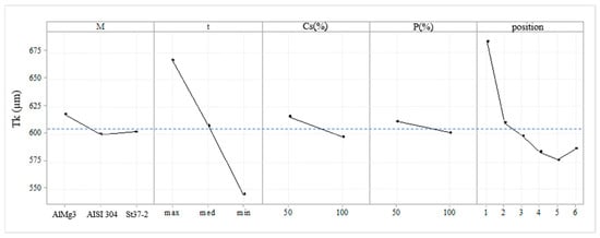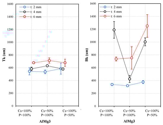 The most statistically significant two-way interactions are shown in Figure 12. The widening of Tk with the decrease in cutting speed was significantly lower, or even eliminated in laser cutting of AISI 304. This effect was also observed for Bk and Ta, which was derived from the kerf width. A possible explanation lies in the range of values selected for AISI 304: as for cutting aluminum alloys, a relatively low cutting speed is more advisable (owing to the high thermal conductivity), in laser cutting of steel, the increase in cutting speed, where possible, could lead to better interaction of the laser beam. The laser beam utilized to the fullest may increase the temperature in the cutting zone, which is likely to result in kerf widening. This explanation has also been proposed with respect to the widening of Tk observed in the main effects plot. The interaction plot of material and thickness shows that, in laser cutting of AlMg3, the widening of kerf width was aggravated with the increase in thickness more than other materials, and this also applied to Bk. AlMg3 is less suitable for CO2 laser cutting of thick sections because of its high reflectivity.