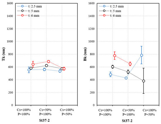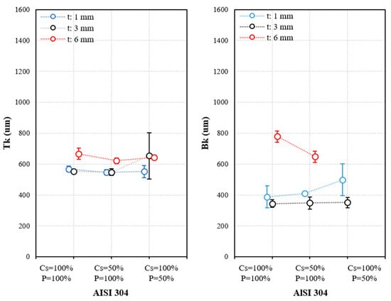 A preliminary inspection was conducted to identify nonvalid cuts (i.e., presence of holes, material projections or uncut areas). This leads to the exclusion from the subsequent analysis of those cutting conditions which do not guarantee suitable kerfs. More specifically, cuts performed on 6 mm thick St37-2 steel using 50 and 100% of gas pressure and cutting speed, respectively, were found to be incongruous, and consequently their kerf width was omitted. Top and bottom kerf widths are illustrated in relation to cutting speed (Cs) and gas pressure (P) in Figure 5, Figure 6 and Figure 7. It can be observed that the kerf width of each material decreased at the decrease of thickness, in accordance with the behavior found in literature [23]. Since the amount of material to be removed increased with thickness, in laser cutting of thick sections, a greater energy contribution was required to obtain through-thickness cuts, which leads to a longer interaction time and increases the thermal erosion. Furthermore, the efficiency of laser beam decreased with increasing workpiece thickness, owing to conductive losses. Therefore, as it was expected, the minimum kerf width of each material was obtained at the thinnest sections. The comparison between top and bottom kerf widths highlights different shapes of kerf profiles. In most cases (and more precisely in the totality of cases when relating to AISI 304), kerf profiles exhibited the typical slight v-profile or parallel-sided sections. More rarely, the kerf profiles widened slightly at the bottom edge of the workpiece.