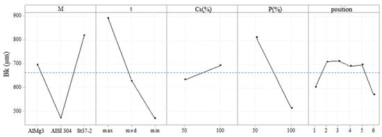 The ANOVA results for geometrical variables are summarized in Table 6, where significant items are indicated in bold. The ANOVA assumes that observations are independent and normally distributed with equal variances between treatments (homoscedasticity). These assumptions were successfully checked using the graphical examination of residuals [24]. However, for the sake of brevity, its results were not included in this analysis. The statistical analysis proved that all main effects were significant at a confidence level of 95%, with the exception of gas pressure and cutting speed for Tk and S, respectively. It is noticed that the greatest effect or significance (which corresponds to the highest F-value) in relation to the top kerf width was certainly obtained by varying the piece thickness. Conversely, Bk was strongly influenced by the material type, followed by thickness and gas pressure.