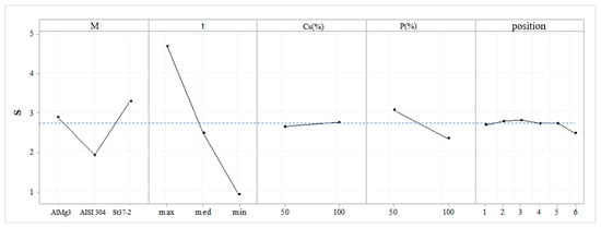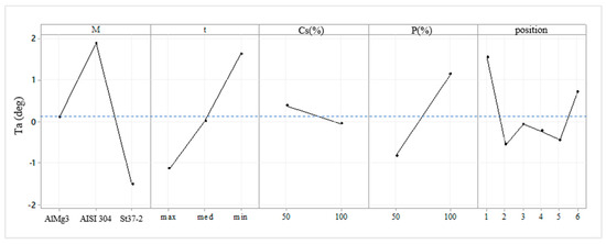 Figure 8 and Figure 9 illustrate the main effects plot for Tk and Bk. The increase in the cutting speed reduced the top kerf width, whereas in contrast the bottom kerf width increased. Indeed, at high cutting speed, the irradiation time between the laser and the material was reduced, and consequently, Tk decreased as the result of the lower energy provided. Conversely, the increase in Bk as the cutting speed increased, although more contained, was unexpected. In the range of tested values for cutting speed, this result could be explained by the change in cut front inclination. At the maximum cutting speed (industrial relevant high cutting speed), the cut front was entirely irradiated by the laser beam, and the temperature of the molten metal at the bottom edge of the workpiece increased [25]. Moreover, Bk decreased when the assisting gas pressure increased, owning to the enhancement of the drag force, which facilitates the effective removal of melt from the groove. As it was expected, position was a significant factor in both Tk and Bk models. From the main effects plot in Figure 8, it is possible to observe that Tk first decreased and then increased gradually with position. This curvature also occurs in Figure 9, where conversely Bk first increased and then decreased with position. The curvilinear shape is explained by the existence of different shapes of the cutting profile, as previously mentioned. Furthermore, narrower kerfs were obtained at small thicknesses, beyond which the kerf width started to widen as the thickness increases. Top and bottom kerf widths showed linear trends in relation to thickness which were very similar to each other. Moreover, since aluminum and its alloys are highly reflective metals, laser cutting of AlMg3 needs more energy input to initiate the cut, thus resulting in larger Tk, in accordance with Ref. [19]. The regression model for Tk reached acceptable adequacy index R-sq of 68.93%, whereas that calculated for Bk was at 76.70%. As it was expected, the taper angle was mainly influenced by the material type. In Figure 10, it is possible to observe that laser cutting of AlMg3 generally produced parallel sided-sections, whereas laser cutting of AISI 304 resulted in the typical v-profile, and laser cutting of St37-2 led to a slight widening of kerf. The latter probably originates by the exothermal reaction. Indeed, in oxygen-assisted cutting, the high-temperature molten metal that is not ejected from the cutting area by the assisting gas adheres to the lateral surface and continues the oxidation reaction (side burning) [26]. Clearly, Ta depends on both top and bottom kerf widths since it was calculated by Equation (1). More specifically, Ta decreased when increasing cutting speed or decreasing workpiece thickness because Bk widening exceeded that of Tk, and it decreased as the gas pressure increased owing to the significant reduction of Bk. Concerning the effect of position on the taper angle, the same considerations applied as for Tk and Bk. The main effects plot for S is illustrated in Figure 11. The section of material removed linearly increased with thickness, and being related to Tk and Bk by means of Equation (2), it was strongly affected by the kerf width. Furthermore, as it was expected, S was insensible to the change in cutting speed, and the impact of position was negligible as well. The adequacy of fit for the regression models of Ta and S was 71.88 and 94.5%, respectively.