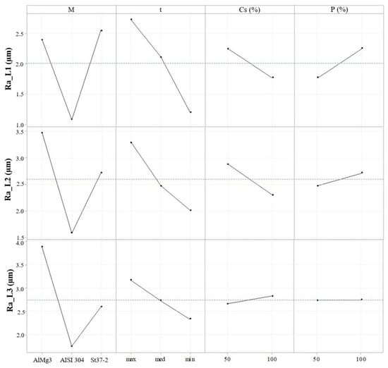 The main effect plots for Ra_L1, Ra_L2 and Ra_L3 are reported in Figure 13. It is noticed that laser cutting of AlMg3 resulted in the highest value of Ra, whereas laser cutting of AISI 304 exhibited the lowest. Furthermore, the arithmetic surface roughness of AlMg3 significantly increased along the laser beam direction, whereas that of AISI 304 remained practically unchanged. St37-2 shows only a moderate increase in Ra. As the melt flows along the laser beam direction, the melt film thickness increased, and the hydrodynamic phenomena in the lower workpiece surface became increasingly important. When the melt viscosity and surface tension were high, the melt accumulated at the bottom of the cut groove where it solidified, creating surface ripples. The main power losses were related to thermal conduction followed by convective cooling performed by the assisting gas [27]. Therefore, this effect was less evident in laser cutting of stainless steel due to its relatively low thermal conductivity.