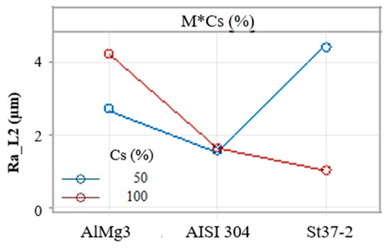 A general decrease in Ra_L2 (that is indicative of the mean surface roughness) was observed when the cutting speed increased. This experimental result, which is apparently in contrast with those of other research studies, can be examined in greater detail in the interaction plot reported in Figure 14. As it was expected, in laser cutting of AlMg3 the lowest value of Ra_L2 (2.68 µm) was achieved at low cutting speed (compared to Ra_L2 = 4.25 µm obtained at high cutting speed), in accordance with the results given in Ref. [19]. In contrast, in laser cutting of St37-2, a higher speed provided the lowest value of Ra_L2 (of ~1.01 compared to 4.41 µm). This behavior could be explained in view of the outcomes described in Ref. [10]. The trend of surface roughness may depend on the range of cutting speed being considered. Indeed, there was a specific range of cutting speed at which Ra was minimum. The arithmetic surface roughness decreased with cutting speed until it reached that optimum, to increase once such threshold was exceeded. Another possible explanation lies in the occurrence of side burning at lower cutting speed, as proposed in Ref. [14]. Finally, AISI 304 was found to be insensitive to changes in cutting speed (~1.63 µm). It is useful to note that this interaction is also found to be significant for geometrical variables.