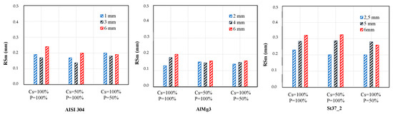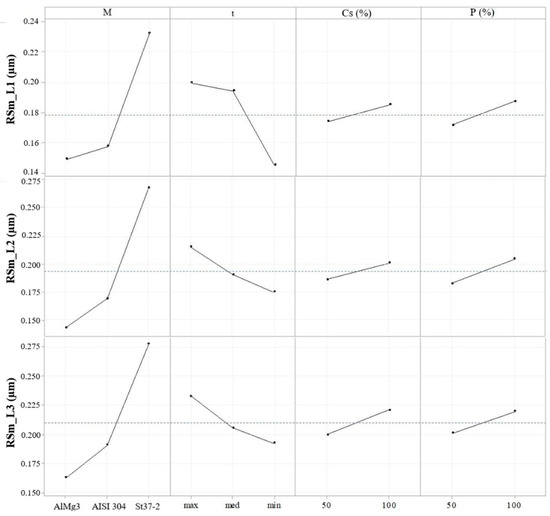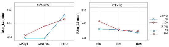 For extensive analysis of the cutting surface morphology, the spacing parameter RSm was selected. From the statistical analysis, RSm_L1 was only affected by workpiece parameters (i.e., material and thickness), whereas RSm_L2 and RSm_L3 were influenced by all the main effects. The only two significant interactions were t*P (%) and M*Cs (%) for RSm_L2 and for RSm_L3, respectively. As shown in Figure 15, laser cutting of AlMg3 provided the lowest value of RSm, followed by laser cutting of AISI 304, whereas laser cutting of St37-2 resulted in the highest. Moreover, unlike the amplitude parameters, RSm_L2 and RSm_L3 increased when increasing cutting speed. More specifically, this result mainly occurred in laser cutting of AISI 304, as shown in Figure 16. In addition, the mean width of profile elements slightly increased when cutting AlMg3, indicating a small irregularity in the drag lines due to the light-reflectivity and heat-conductivity of this material, in line with Ref [16]. In laser cutting of St37-2, similar to Ra and Rz, RSm also increased from 0.27 to 0.29 mm as the cutting speed decreased. According to the cycling side burning theory, side burning occurs at cutting speeds smaller than the reaction front speed, resulting in the formation of periodic patterns [29].