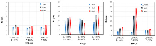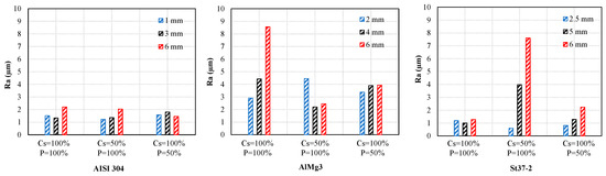 In order to highlight the interdependence of laser parameters, the computed values of roughness parameters of each material and thickness (averaged over the three profiles acquired on both sides of kerf) are illustrated in relation to cutting speed (Cs) and gas pressure (P) in Figure 17, Figure 18 and Figure 19. It is possible to note that laser cutting of AISI 304 exhibited good surface roughness for all the tested conditions, and thickness had a major impact on Ra (Figure 20a,b). Conversely, laser cutting of AlMg3 showed the highest surface roughness, in particular at the maximum thickness. The worst conditions in absolute terms occurred when cutting 6 mm thick AlMg3 at high cutting speed and gas pressure (Figure 21a), showing that despite the low melting point of aluminum alloys, the high thermal conductivity and light reflectivity required more energy to produce a fault-free cut edge.