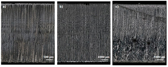 AlMg3 kerf lateral surface: (a) 6 mm, Cs = 100% P = 100%; (b) 6 mm, Cs = 50% P = 100%; (c) 4 mm, Cs = 50% P = 100%.