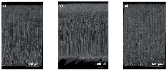 St37-2 kerf lateral surface: (a) 5 mm, Cs = 100% P = 100%; (b) 5 mm, Cs = 50% P = 100%; (c) 2.5 mm, Cs = 50% P = 100%.