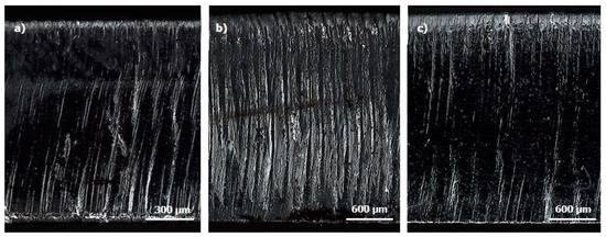 AISI 304 kerf lateral surface: (a) 6 mm, Cs = 50% P = 100%; (b) 3 mm, Cs = 50% P = 100%; (c) 3 mm, Cs = 100% P = 100%.