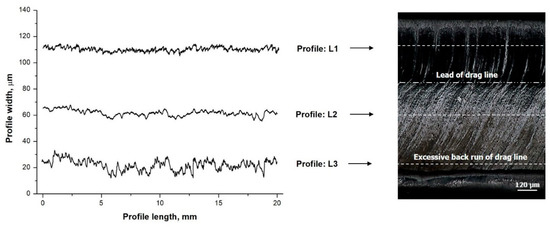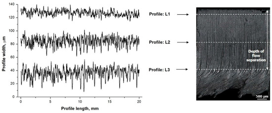The roughness of the side cut surface is a typical issue of laser beam cutting and a critical factor for laser cut quality. The formation of a drag line arises from irregularity in the laser beam process such as small drifts or disturbances, solidification of melted material and curvature of the cut front. The cut surface roughness was measured in terms of arithmetic mean surface roughness (Ra), surface roughness depth (Rz) and mean width of profile elements (RSm) perpendicular to the cutting direction, on an evaluation length of 20 mm with a spacing of 2 µm (in accordance with ISO 4287:1997). The roughness profiles were measured using an inductive profilometer (Taylor Hobson Talysurf CLI 2000) equipped with a spherical diamond tip (2 µm radius) and processed by means of a surface analysis software (Talymap Universal 3.1.4). Since, as known, surface roughness is generally worse in the bottom edge, roughness measurements were executed at different heights of the workpiece thickness on each side of the cut. Profiles were acquired on the cut surface in the upper workpiece surface (L1), in the middle of the workpiece thickness (L2) and in the lower workpiece surface (L3), as shown in Figure 4.
