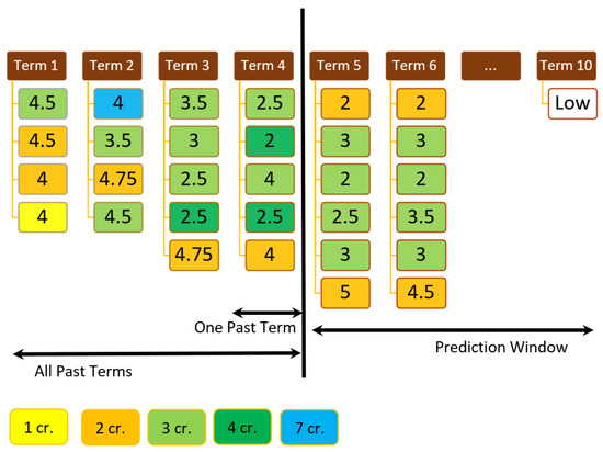 Figure 3 shows a sample student transcript data for the first 6 terms. For instance, let us consider predicting the graduation GPA class at the end of the second year, which is the end of the term 4, if we want to use one term observation history, then we use the term 4 performance alone, either as the term courses which is the vector