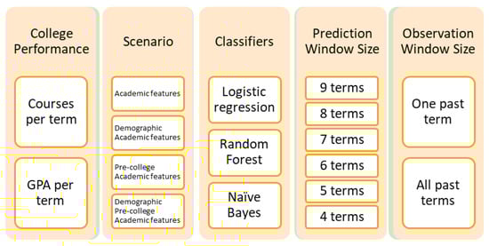 Section 2.1) that differ with respect to (1) the way college performance is defined, (2) the type of student’s data included, (3) the machine learning algorithm applied, (4) the size of the performance window, and (5) the size of the observation window (historical data).