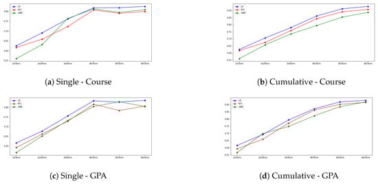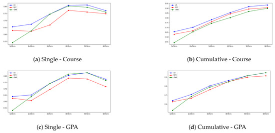 For investigating the impact of the prediction window, we develop six models at different times of the curriculum, (1) as early as by the end of the first semester of the preparatory year,