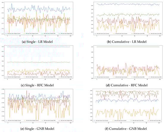 Figure 9 illustrates the train and test accuracy scores by the number of experiments of all ML models on term 6. In all the plots, it is clearly visible that the difference between the green and the red curves (train and test of the GPA models) is less than the difference between the blue and the orange curves (train and test of the Course models). This indicates that if we introduce academic performance into the models