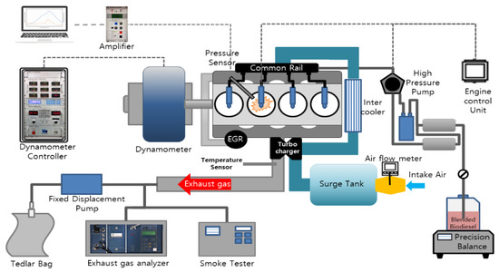 The experimental equipment diagram is shown in Figure 1. The test engine was installed on an eddy current dynamometer (DY-230 kW, Hwanwoong Mechatronics, Gyeongsangnam-do, Korea). The combustion pressure was measured using a piezo-electric type pressure sensor (Kistler, 6056a, Winterthur, Switzerland) located at the position of the glow plug, and the data were recorded and analyzed by a DAQ board (PCI 6040e, National Instrument, Austin, TX, USA). The levels of NOx and CO were measured using a multi-gas analyzer MK2 (Euroton, Italy), and the level of HC was measured by an HPC501 analyzer (Pantong Huapeng Electronics, China). The smoke opacity level was measured using a partial flow collecting type soot analyzer (OPA-102, Qurotech, Korea) based on the level of opacity. The fuel flow was calculated by measuring the fuel weight change over 10 min on a high-precision digital electronic weighing balance (AND, GP-30 K). The exhaust gas temperature was measured after the turbocharger.