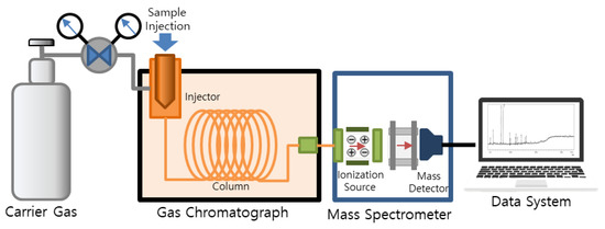 The VOCs were analyzed by a purge & trap analyzer (JDT-505II/2010 GC/QP2010MS, Japan Analytical Industry, Tokyo, Japan) [10,45]. JDT-505II and 2010GC / QP2010MS were used for the purge and trap sampling and analysis of VOCs. Figure 2 shows the analysis system for VOCs, and the procedures are as follows. The diluted VOCs in a tedlar bag were absorbed by a tenax Absorber (Tenax-GR: Japan analytical Industry, Tokyo, Japan). The chromatogram and mass spectrometer separate the VOCs sampled from the exhaust gas and show information related to the composition of VOCs of the exhaust gas sample and the results related to the emission quantity based on the peak area of each VOC calculated with the peak height and its duration [46,47].