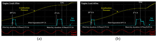 In this experiment, the rotational speed of the engine was set to the low idle, 750 rpm. The engine loads were no engine load (0 Nm) and 40 Nm to reflect load conditions of real vehicles equipped with the auxiliary systems at idle. In real cars, devices such as air conditioners and generators are installed, and the engine is loaded to operate even at low idle conditions. The main injection timing was fixed at 2 degrees of crank angle (°CA) before top dead center (BTDC) and pilot injection timing was fixed at 20 °CA BTDC, and the injection pressure was applied at 280 bar. EGR was not operated at a low idle condition. The injection timings and durations by injection pressures measured of the current for injection from ECU are shown in Figure 3. As the engine load increased, the main injection duration was increased from 0.50 ms to 0.75 ms (2.3 °CA to 3.4 °CA). However, the durations of pilot injections of both engine loads were all kept at 0.35 ms (1.5 °CA). This means that only the main injection quantity was increased to meet an engine load of 40 Nm without increasing pilot injection quantity.