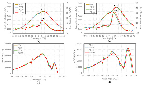 Combustion pressure and heat release rate of (a) 0 Nm, and (b) 40 Nm; combustion pressure rise rate of (c) 0 Nm, and (d) 40 Nm.