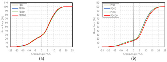 The mass fraction burned (MFB) was calculated using the heat release rate as shown in Figure 5. The combustion condition in the cylinder can be verified in this manner. The crank position where the MFB is 10% from the start of the pilot injection is denoted as CA10, 50% is CA50, and the point where the MFB becomes 90% is denoted as CA90. The difference between the fuel injection start point and CA10 is called the flame-development angle (or duration), and the difference between CA10 and CA90 is called the rapid-burning angle or combustion duration. CA50 shows where the MFB is 50%, which means that 50% of the injected fuel is converted to energy [57,58]. Table 6 shows the rapid-burning angle and rapid-burning angle calculated by analyzing the MFB at each condition.