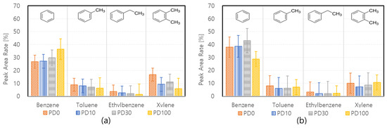 The results of VOCs analyzed with GC/MS for each test fuel are shown as the VOCs detected for each test condition in Table 8 and Table 9. At an engine load of 0 Nm, 10 types were detected for PD0, 11 types for PD10, 10 types for PD30, and 14 types for PD100. At 40 Nm, 10 types were observed for PD0, 10 types for PD30, and 12 types for PD100. Higher blend ratios of palm oil biodiesel result in more complex combustion reactions within the cylinder.