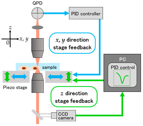 Experimental setup for OT (optical trapping) and LI (laser interferometry) that is implemented with 3-D feedback-control of piezo stage. Incident beam is tightly focused near the probe particle in a cell by the objective lens. Scattered and unscattered lights are collimated by the condenser lens; the QPD at the BFP of the condenser lens detects the laser refraction that is proportional to the probe offsets in (x, y). QPD signal is applied to the measure input of the PID controller for the feedback control of the piezo stage for horizontal directions (x, y). Microscopic image is captured and analyzed in the personal computer to obtain z position of the probe. The feedback control signal for z direction is then created and applied to piezo.