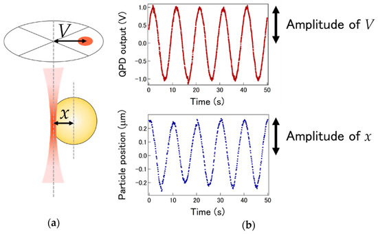 Laser interferometry (LI) is a technique to detect the position of a trapped particle with a high spatio-temporal resolution [6]. As shown in Figure 1b, the trapped particle with the displacement x from the optical axis diffracts the probe laser. After being collimated, the outgoing laser is projected on to the quadrant photodiode that images the back-focal plane of the condenser lens. When the probe particle is smaller than the beam waist (w0) or the wavelength (λ) of the trapping laser, the scattered and unscattered light creates an interference pattern at the QPD. The technique is therefore conventionally referred to as back-focal-plane laser interferometry (LI) [6]. LI measures the QPD output voltage which is proportional to the normalized difference of the laser intensities (I+ and I−) that arrive at (+) and (−) halves of the QPD, respectively. Here, M indicates the gain of electronic amplifiers. Within the linear range where the QPD output V(t) is proportional to the probe displacement x from the optical axis, and LI measures x with high spatio-temporal resolution.