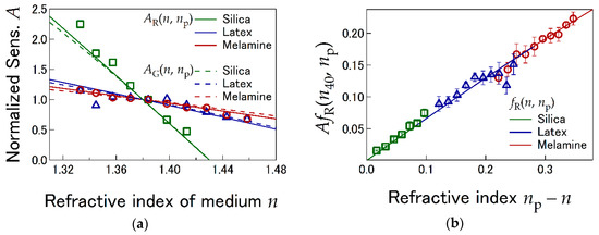 LI sensitivity and OT strength change owing to the slight alteration of optical settings of the equipment. For instance, separation between the probe particle and the condenser lens (2.80 mm) changes while exchanging samples repeatedly, affecting the optical magnification for the diffraction of the laser. Even the laser emission is slightly altered once the laser is turned off and restarted. These factors affect the sensitivities via G (a, w0, λ) in Equation (3). As a control, immediately before or after every experiments, sensitivity S40 was measured in a reference media (40 wt% glycerol solution) without changing any other conditions of experimental settings. Further, 40% glycerol solution was chosen as a reference material since its refractive index n40 = 1.384 is close to that of the cell interior [9,25,26,27,28,29,30,31]. The normalized LI sensitivity A was then obtained by dividing S with S40 as S/S40 = f(n,np)/f(n40,np). Therefore, the theoretical predictions of the normalized sensitivities are given for geometrical and Rayleigh approximations as,