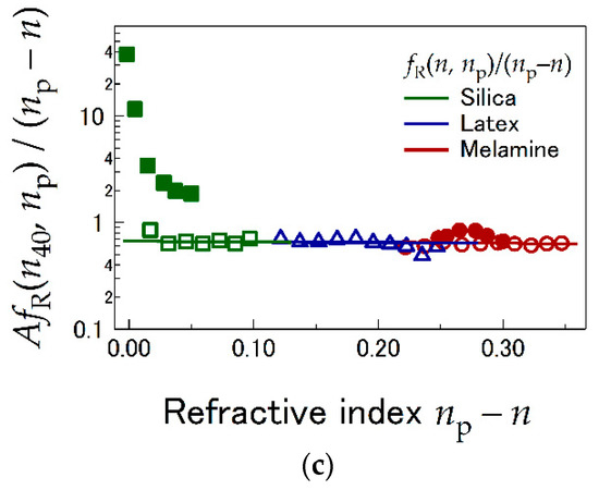 On the basis of the observation above, the sensitivity f(n, np) which is not affected by the uncontrollable factor G can be estimated as A fR(n40, np) where n40 represents the refractive index of 40% glycerol solution. As it is shown in Figure 4b, all f(n, np) estimated from experimental results are collapsed to a single line that is proportional to Δn np − n, and they agree well to theoretical prediction fR(n, np). Note that OT and LI experiments, including ours, are possible at conditions where np is slightly larger than n since the scattering force prevents OT at too large Δn [1]. In this case, f(n, np) is simply proportional to Δn and does not largely depend on the regimes for approximations, which is consistent to our results. The LI sensitivity is the largest for melamine particle (Figure 4b).