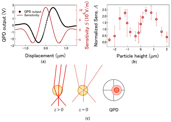It has been expected that the LI sensitivity could have larger tolerance on the probe offset in the z direction (axial offset) compared to the radial offsets. However, z offset also affects the sensitivity when the probe fluctuations are vigorous [37]. Therefore, in this study, we have searched for the best z position for the sensitivity of LI. Probe particles were dispersed in an elastic hydrogel (0.5 wt% agarose [38]) and LI sensitivity was measured as a function of the probe position in z direction. The melamine particle with 2a = 1 µm diameter was used as a probe. Since the agarose gel is highly elastic at the concentration prepared for our experiments, a weak optical trap does not substantially affect the probe position. Therefore, we measured the LI sensitivity while scanning the axial position (z) of the probe. As shown in Figure 6b, the best sensitivity was not obtained when the probe is located at the plane of the laser focus (z = 0) [37]. The sensitivity increases when the probe is above the laser focus (z > 0) and reaches its maximum at z ~ 0.4 µm. Since the probe particle could work as a convex lens and reduce the size of the laser profile at the BFP while the average deflection of the laser is less affected (Figure 6c), the sensitivity takes the maximum there. When the probe is situated beneath the plane of the laser focus (z < 0), on the other hand, the dispersion of sensitivities was larger. Although the mean sensitivity takes its second maximum around z ~ −1.2 µm, LI experiments are not appropriate at z < 0 because of the large errors.