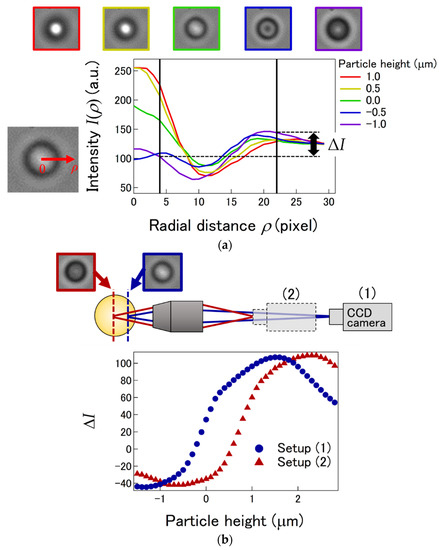 (a) Pixel intensity of particle image I(ρ) as a function of radial distance ρ from the center in the range of probe heights between z = −1.0 μm to 1.0 μm. is given in the pixel unit (5.1 × 10−8 m/pix) and the intensities averaged in angular directions are shown. Upper figures show microscope image of probe particles (melamine 2a = 1 µm) imbedded in agarose gel (0.5 wt%). Colors used for the outline of the microscopic image correspond to the particle height of each curves in the graph. (b) ΔI (the difference of pixel intensities at ρ = 4 and 22) as a function of the probe height. The definition of ΔI is shown by using the vertical solid line and the dotted line in Figure 7a. Blue circles correspond to the data taken in the setup (1) which is the condition used to obtain data shown in (a). Red triangles were obtained in the setup (2) after shifting the focus of the microscopic image by moving the position of the video camera while the radial distances of ΔI was fixed (ρ = 4 and 22). Upper schematic illustrations show charge-coupled device (CCD) camera setup (1) and (2) together with the microscope images of the probe at z = 0.