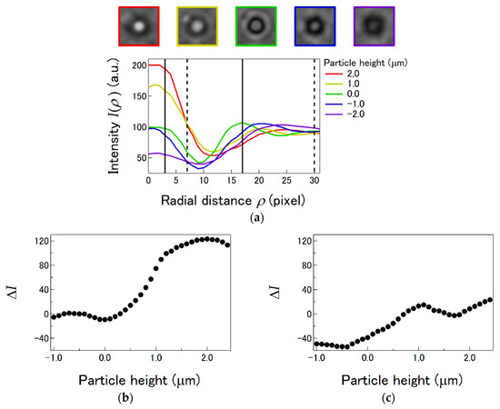 (a) I(ρ) in living HeLa cells measured while controlling the feedback in x and y directions. Height dependence of microscope images were recorded while quickly scanning w/o z feedback. Results are shown similar to those in Figure 7a. (b) as a function of particle height. was determined from I(ρ = 3 pix) and I(ρ = 17 pix), as shown by the vertical solid lines in (a). Linear region is 0.5 µm < z < 1 µm. (c) Another height dependence of that was determined by I(ρ = 7 pix) and I(ρ = 30 pix), as shown by the broken lines in (a). Linear region is shifted to −0.4 µm < z < 1 µm.