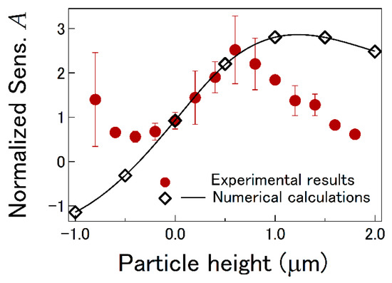 Numerical calculations based on Lorenz–Mie theory were conducted in order to predict z dependence of LI sensitivity. Using Mieplot software [32], calculations were conducted using parameters relevant for our experimental conditions (a, λ, w0, n, and np are 0.5 µm, 1064 nm, 0.55 µm, 1.38, and 1.68, respectevely). For each vertical offset z, we calculated the laser scattering caused by small offsets (x, y), and then obtained the sensitivity Sth(z). Out-going laser lights were collected in the far field within the scattered angle < 46.4° (relevant to the numerical aparture of condenser lens, NA = 1.0). The normalized LI sensitivity Ath(z) was then obtained as Ath(z) Sth (z) S(0)/Sth (0).