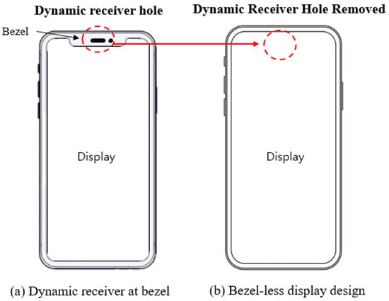 Nowadays, the design trend of the smartphone is shifting toward bezel-less display. Owing to enlarged display, the available space for the dynamic receiver has decreased. The sizes of the holes for dynamic receivers have been reduced, and some parts of the display panels have been either cut or modified to allow for the dynamic receiver holes. However, the dynamic receiver holes are a hindrance to bezel-less display design. The design changes in smartphones are shown in Figure 1.
