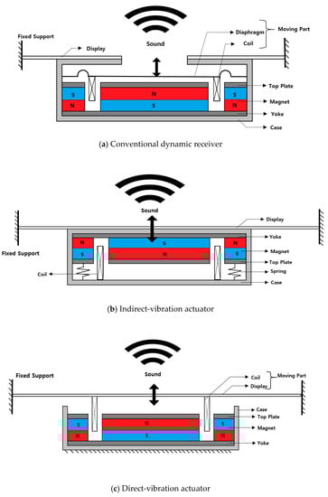 The conventional dynamic receiver generates sound by directly vibrating a diaphragm connected to a moving coil, and the sound is transmitted to a listener through a hole located at the top of the display panel. The simplified structure of the dynamic receiver is shown in Figure 2a.