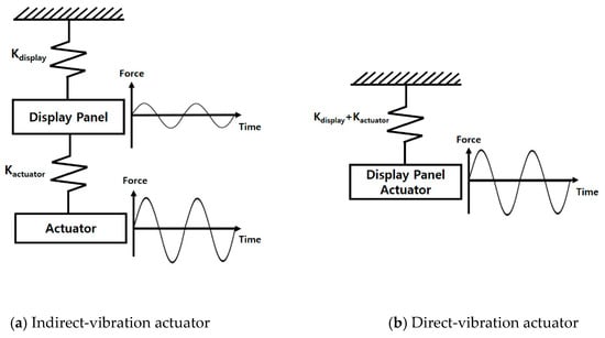 Sound can be generated by vibrating elastic objects. In a smartphone, the vibrating display can generate sound that replaces the dynamic receiver. For a bezel-less-display smartphone, indirect-vibration actuators have been introduced and analyzed [10]. In the indirect-vibration actuator, the oscillating coil is located inside a case. Then, the coil vibrates the case, which transmits vibrations to display panel. The vibrating display generates the sound that the users can hear. The simplified structure of the indirect-vibration actuator and the working principle described using the mass and spring system are shown in Figure 2b and Figure 3a, respectively.