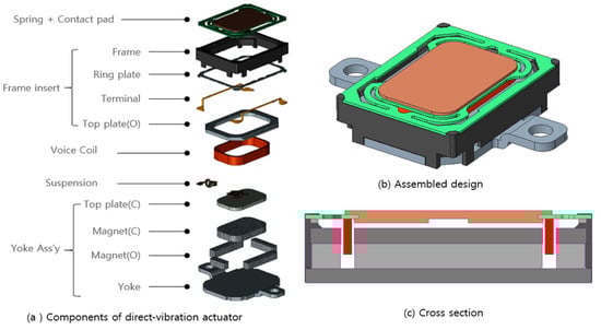 Considering manufacturing assembly, the actuator components are grouped as Figure 4a. The spring and contact pad is connected directly to the display panel. Under the spring and contact pad, the frame insert is added for the purpose of holding the entire actuator component. The Yoke ass’y consist of center top plate, magnets and yoke which forms a part of electromagnetic circuit. The voice coil is inserted between the center top late and outer top plate with suspensions. After the assembly, the moving voice coil is connected with the spring, suspension and a contact pad where it vibrates the display panel. The assembled design and cross section view is depicted in Figure 4b,c, respectively. Owing to limited space, the exterior dimensions are limited to 13 × 10.0 × 3.5 mm. The resistance of the coil is 6 Ω with an input power of 1 W.