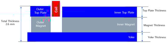 The thicknesses of the top plate, yoke, and permanent magnets directly affect the force factor. The total thickness, including the top plate, yoke, and permanent magnet, should be 2.6 mm. The thickness of each component is briefly shown in Figure 6.